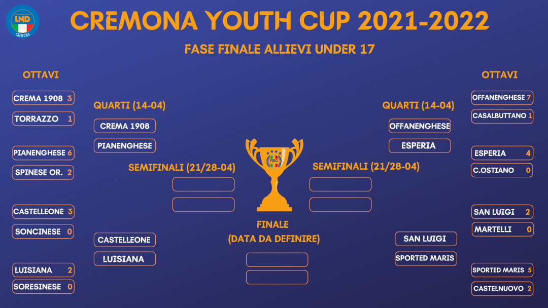 Complimenti ai nostri allievi!Dopo aver superato brillantemente i quarti di finale con una vittoria per 2-0 contro la Sported Maris, passano in semifinale: si giocherà contro l'Esperia giovedì 21 aprile a Cremona e giovedì 28 aprile alle 20:30 al Comunale. Vi aspettiamo numerosi a tifare e sostenere i nostri ragazzi!...