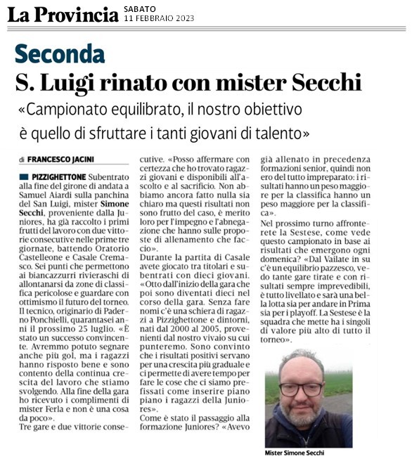 Leggi l'intervista a Mister Simone Secchi pubblicata sul quotidiano La Provincia di Cremona.